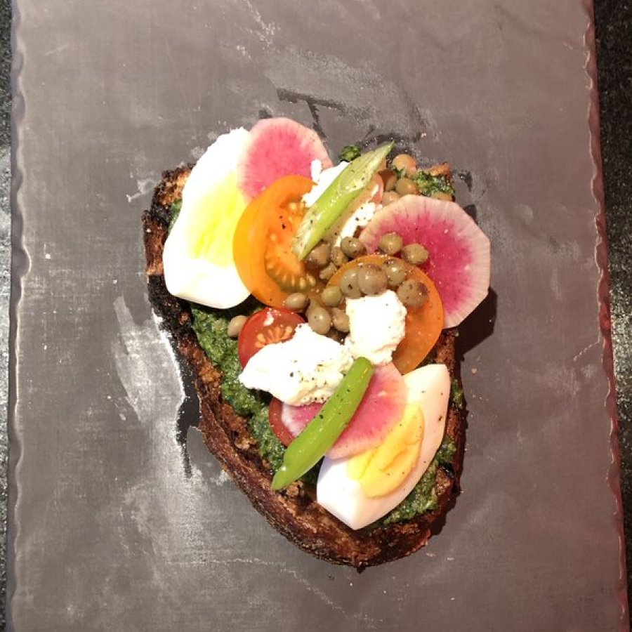 Engrasa ligeramente las rebanadas de pan y colócalas debajo de la parrilla o la tostadora. Mientras se tuesta el pan, lava y corta los tomates en cuatro. Unta las rebanadas de pan con pesto de rúcula. Marina los gandules con la cebolleta y un toque de vinagre. Corta los rábanos en tiras finas y extiéndelos sobre el pan. Agrega los huevos cocidos y sazonados en cuartos, los tomates, el aguacate y los gandules marinados a cada tostada. Rocía con aceite de oliva y agregue sal y pimienta encima.